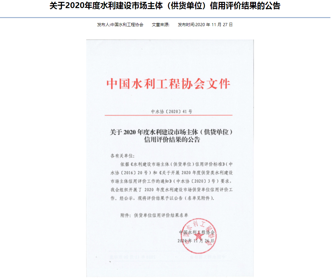 轉(zhuǎn)發(fā) 關(guān)于2020年度水利建設(shè)市場主體(供貨單位)信用評價結(jié)果的公告